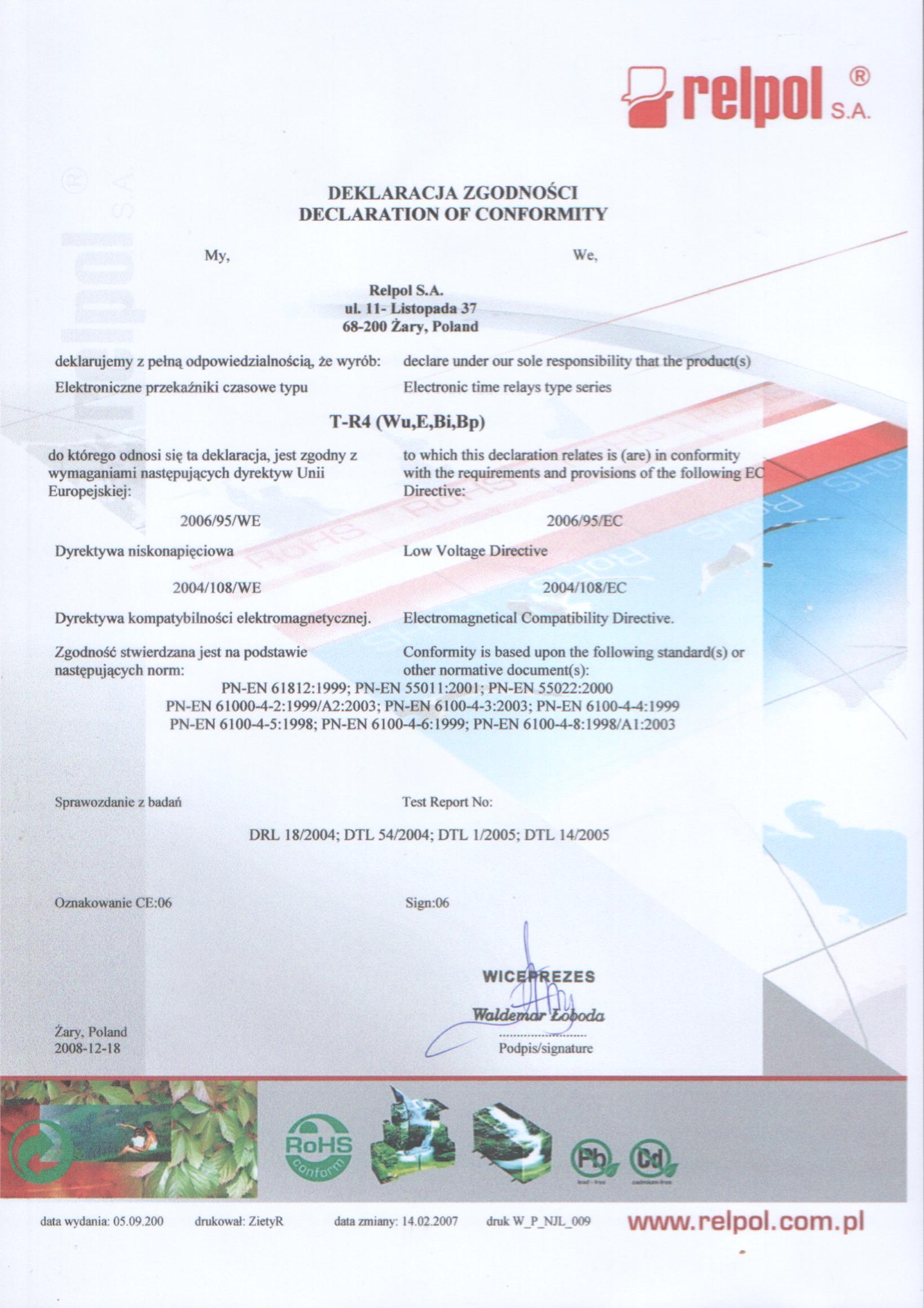 Przekaźnik czasowy T-R4Bp-2014-23-5115 jednofunkcyjny: 4P - cztery zestyki przełączne. Funkcja Bp - praca cykliczna rozpoczynająca się od przerwy. Wejście - zaciski: A1 - A2, napięcie zasilania Un - 115 V AC. Wyjście: zestyki 4P - zaciski: 11(9)-12(1)-14(5), 21(10)-22(2)-24(6), 31(11)-32(3)-34(7), 41(12)-42(4)-44(8), AC1 - 6 A / 230 V. Do gniazda wtykowego GZM4 lub GZT4. Wymiary zestawu T-R4 + GZM4: 75 x 27 x 93,5 mm; zestawu T-R4 + GZT4: 76,3 x 27 x 91,5 mm. Montaż na szynie 35 mm lub na płycie montażowej dwoma wkrętami M3. Zestaw - IP 20.