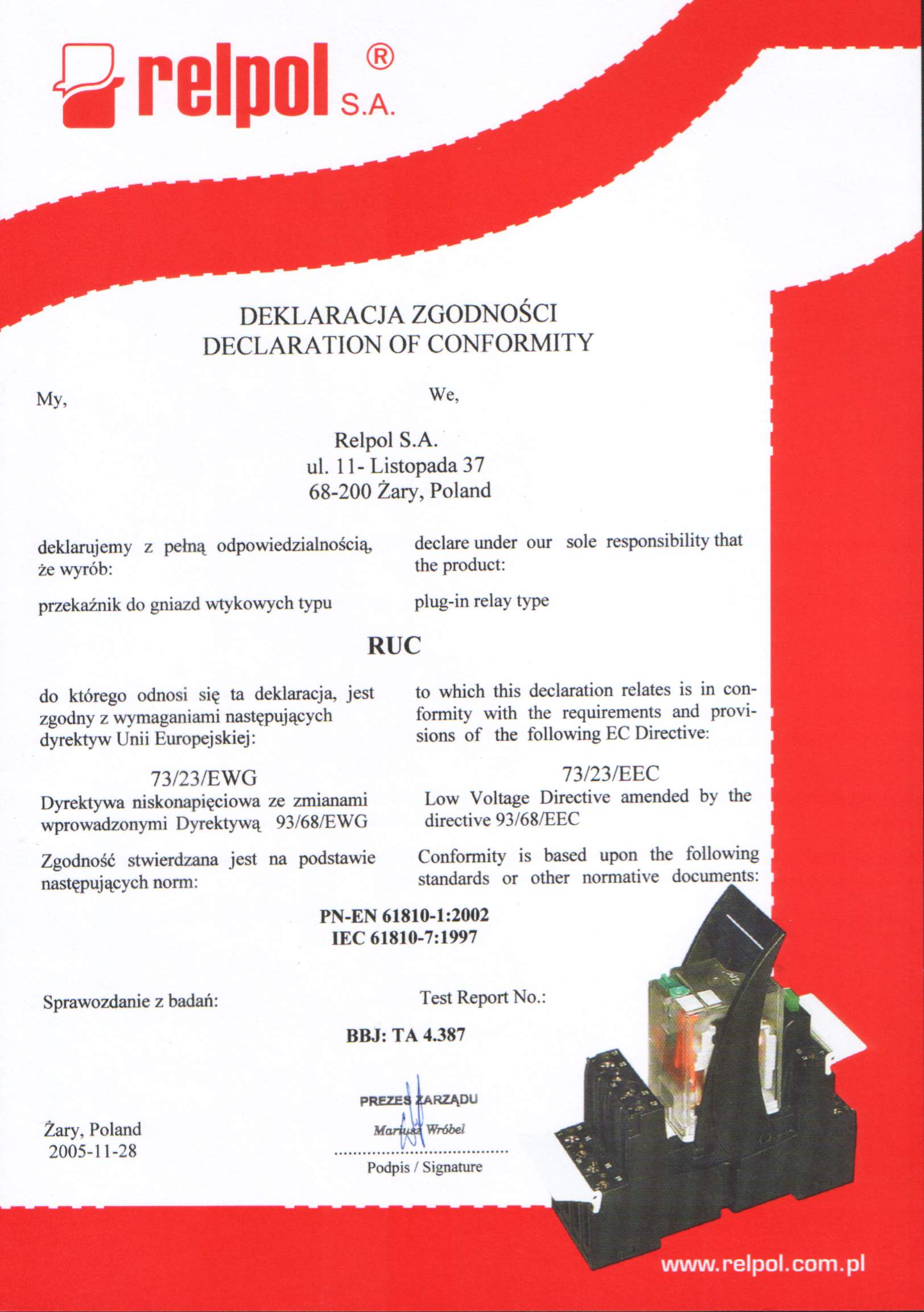 Przekaźnik elektromagnetyczny RUC-1012-26-5230 przemysłowy - małogabarytowy, do gniazda wtykowego. Wyjście: 2P - dwa zestyki przełączne - wyprowadzenia: 11(7)-12(1)-14(4); 31(9)-32(3)-34(6); AC1 - 16 A / 250 V, 10 A / 400 V; DC-1 - 16 A / 24 V. Wejście / cewka: A1(A) - A2(B), napięcie zasilania Un - 230 V AC. Wymiary: 36,1 x 38,6 x 45,5 mm. IP 00. Materiał styków: AgCdO. Wymiary zestawu RUC + gniazdo GUC11 + obejma MBA: 82 x 42,2 x 76 mm. Zestaw - IP 20.